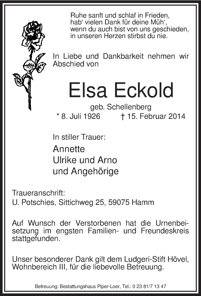Hier finden Sie alle Traueranzeigen aus der Zeitung, die bisher für Elsa Eckold erschienen sind. Weitere Traueranzeigen, die in der Zeitung erscheinen, werden hier ebenfalls aufgelistet