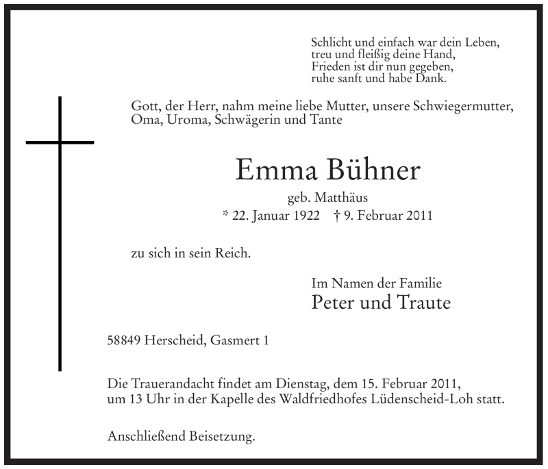 Hier finden Sie alle Traueranzeigen aus der Zeitung, die bisher für Emma Bühner erschienen sind. Weitere Traueranzeigen, die in der Zeitung erscheinen, werden hier ebenfalls aufgelistet