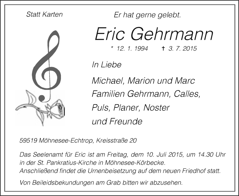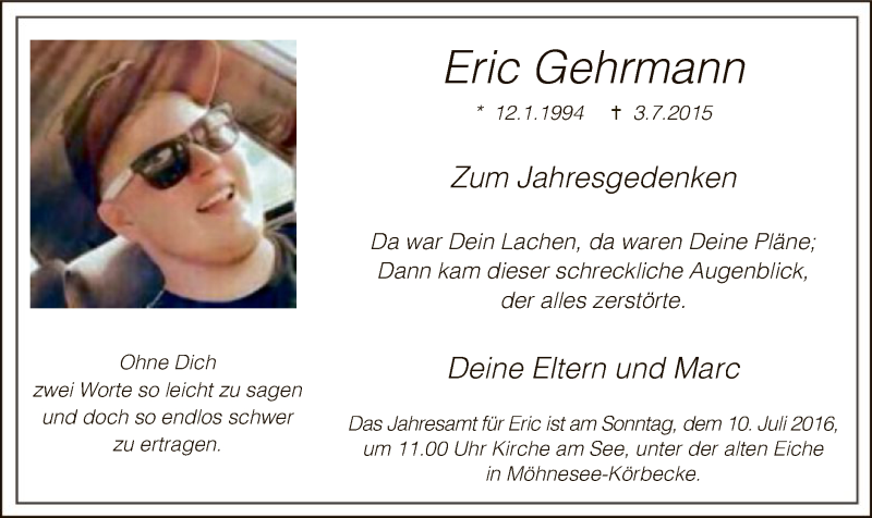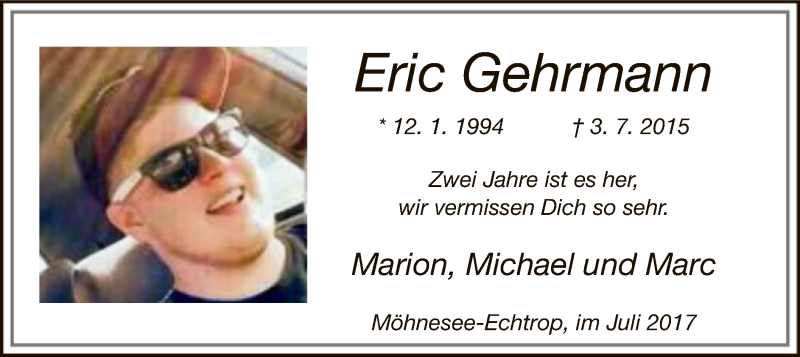 Hier finden Sie alle Traueranzeigen aus der Zeitung, die bisher für Eric Gehrmann erschienen sind. Weitere Traueranzeigen, die in der Zeitung erscheinen, werden hier ebenfalls aufgelistet