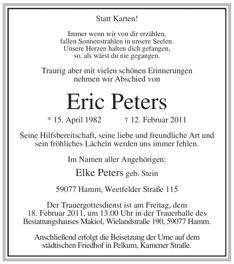 Hier finden Sie alle Traueranzeigen aus der Zeitung, die bisher für Eric Peters erschienen sind. Weitere Traueranzeigen, die in der Zeitung erscheinen, werden hier ebenfalls aufgelistet