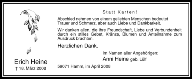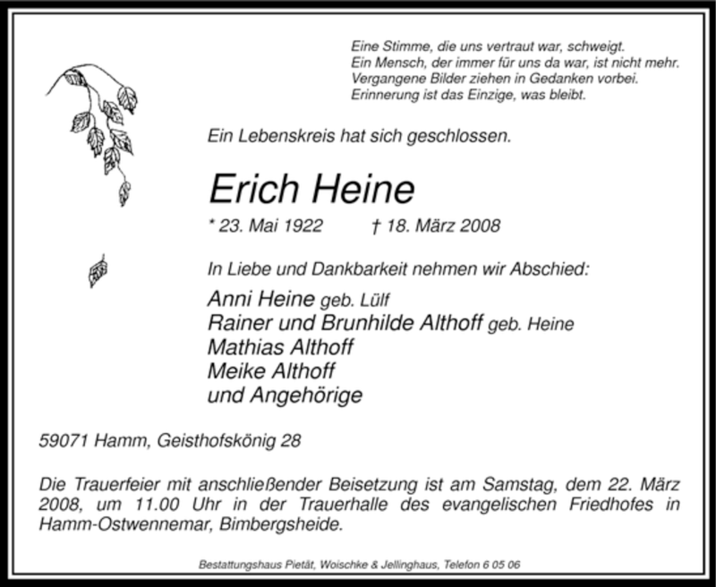 Hier finden Sie alle Traueranzeigen aus der Zeitung, die bisher für Erich Heine erschienen sind. Weitere Traueranzeigen, die in der Zeitung erscheinen, werden hier ebenfalls aufgelistet