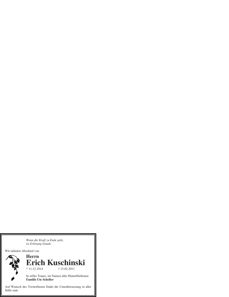Hier finden Sie alle Traueranzeigen aus der Zeitung, die bisher für Erich Kuschinski erschienen sind. Weitere Traueranzeigen, die in der Zeitung erscheinen, werden hier ebenfalls aufgelistet