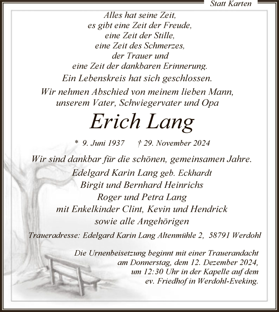 Hier finden Sie alle Traueranzeigen aus der Zeitung, die bisher für Erich Lang erschienen sind. Weitere Traueranzeigen, die in der Zeitung erscheinen, werden hier ebenfalls aufgelistet