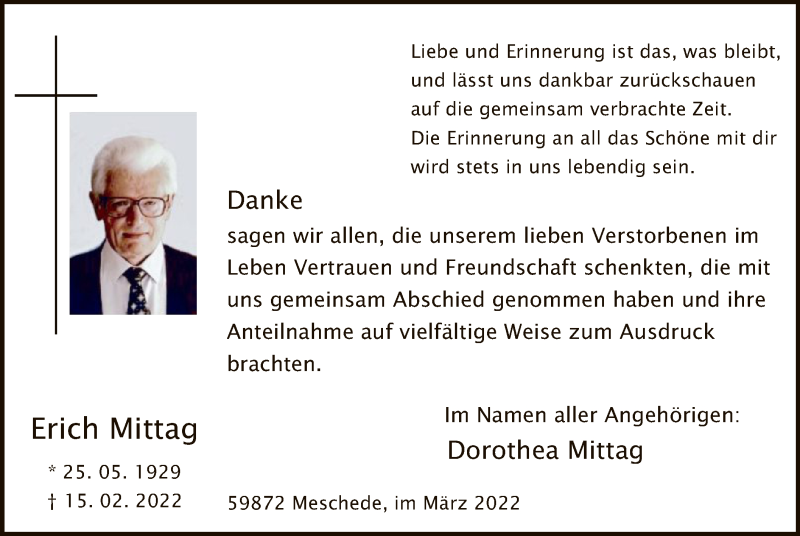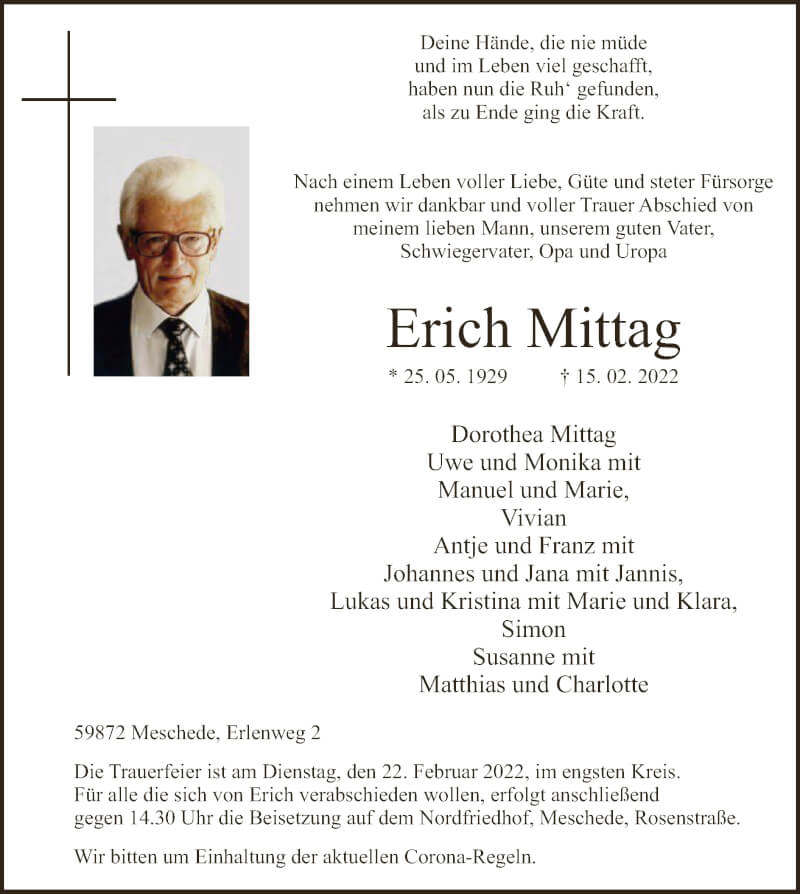 Hier finden Sie alle Traueranzeigen aus der Zeitung, die bisher für Erich Mittag erschienen sind. Weitere Traueranzeigen, die in der Zeitung erscheinen, werden hier ebenfalls aufgelistet