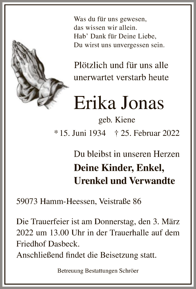 Hier finden Sie alle Traueranzeigen aus der Zeitung, die bisher für Erika Jonas erschienen sind. Weitere Traueranzeigen, die in der Zeitung erscheinen, werden hier ebenfalls aufgelistet