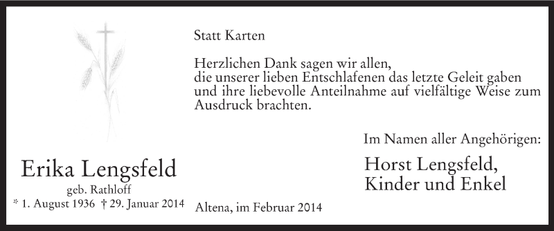 Hier finden Sie alle Traueranzeigen aus der Zeitung, die bisher für Erika Lengstfeld erschienen sind. Weitere Traueranzeigen, die in der Zeitung erscheinen, werden hier ebenfalls aufgelistet