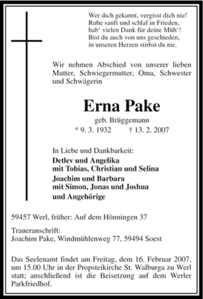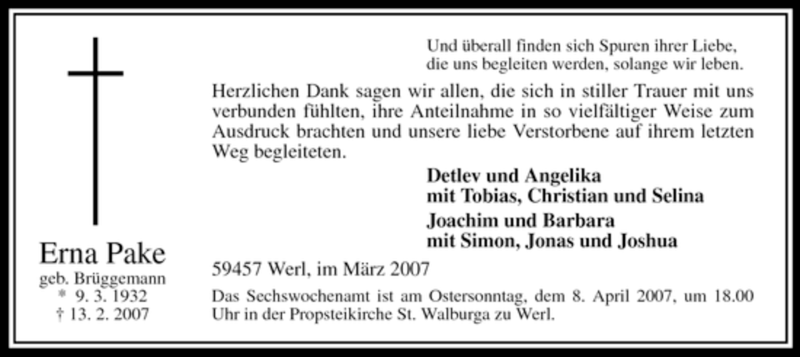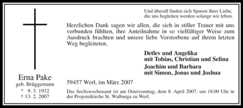 Hier finden Sie alle Traueranzeigen aus der Zeitung, die bisher für Erna Pake erschienen sind. Weitere Traueranzeigen, die in der Zeitung erscheinen, werden hier ebenfalls aufgelistet