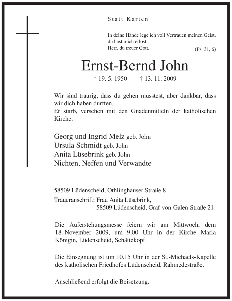 Hier finden Sie alle Traueranzeigen aus der Zeitung, die bisher für Ernst-Bernd John erschienen sind. Weitere Traueranzeigen, die in der Zeitung erscheinen, werden hier ebenfalls aufgelistet