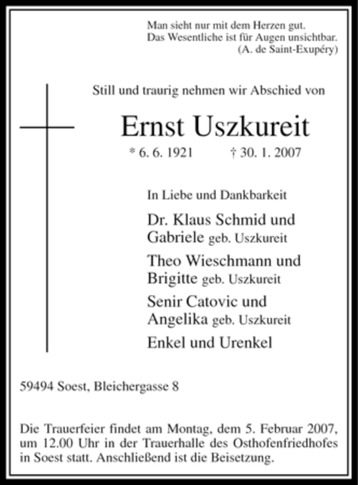 Hier finden Sie alle Traueranzeigen aus der Zeitung, die bisher für Ernst Uszkureit erschienen sind. Weitere Traueranzeigen, die in der Zeitung erscheinen, werden hier ebenfalls aufgelistet