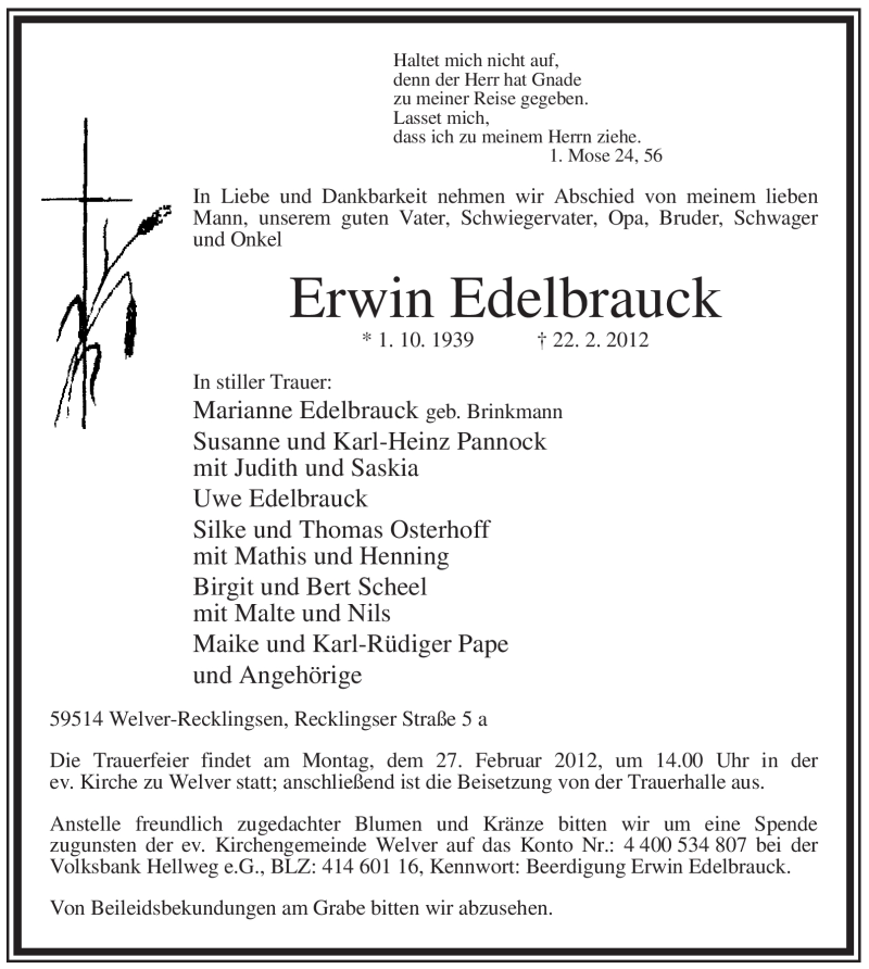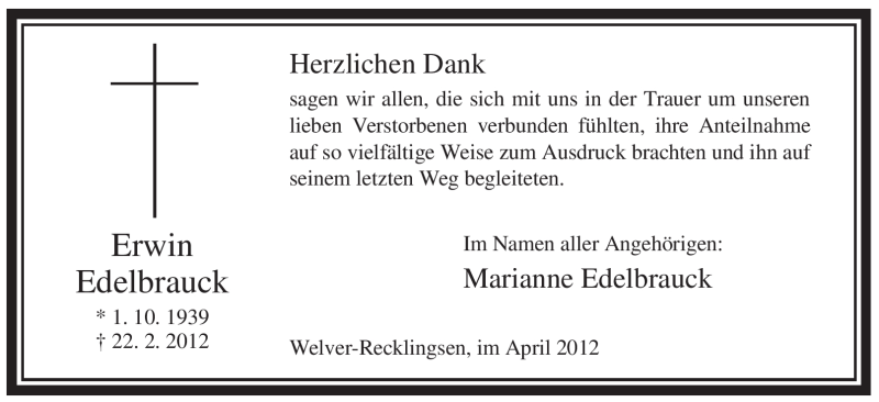 Hier finden Sie alle Traueranzeigen aus der Zeitung, die bisher für Erwin Edelbrauck erschienen sind. Weitere Traueranzeigen, die in der Zeitung erscheinen, werden hier ebenfalls aufgelistet