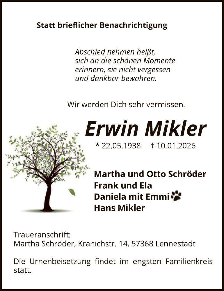 Hier finden Sie alle Traueranzeigen aus der Zeitung, die bisher für Erwin Mikler erschienen sind. Weitere Traueranzeigen, die in der Zeitung erscheinen, werden hier ebenfalls aufgelistet