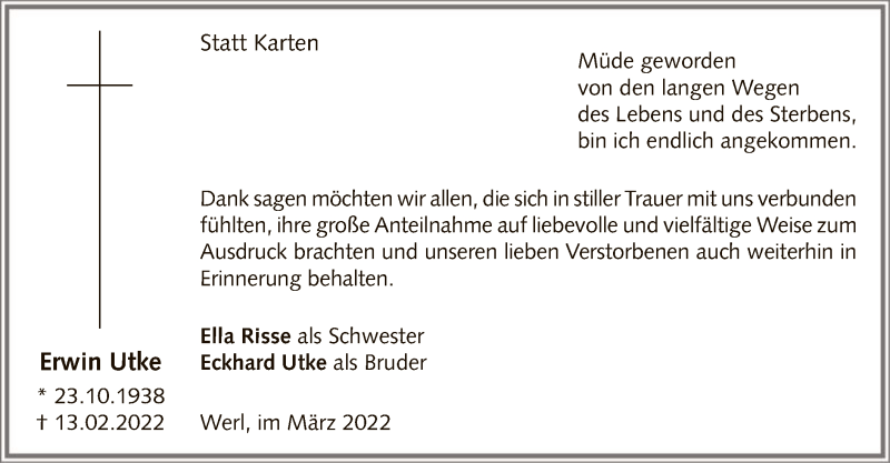 Hier finden Sie alle Traueranzeigen aus der Zeitung, die bisher für Erwin Utke erschienen sind. Weitere Traueranzeigen, die in der Zeitung erscheinen, werden hier ebenfalls aufgelistet