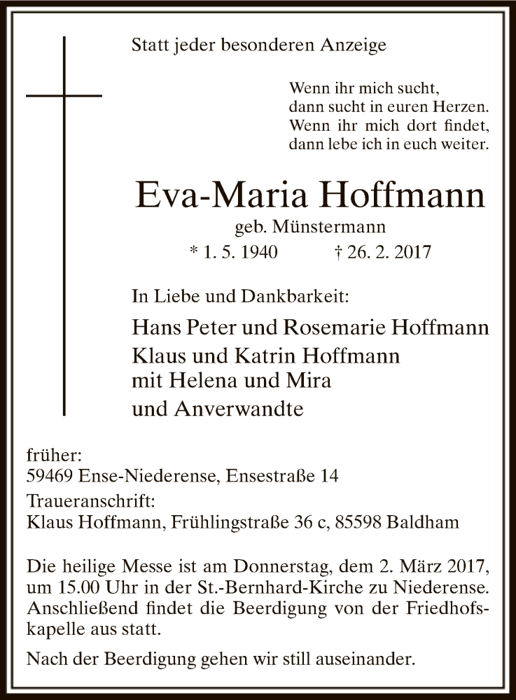 Hier finden Sie alle Traueranzeigen aus der Zeitung, die bisher für Eva-Maria Hoffmann erschienen sind. Weitere Traueranzeigen, die in der Zeitung erscheinen, werden hier ebenfalls aufgelistet