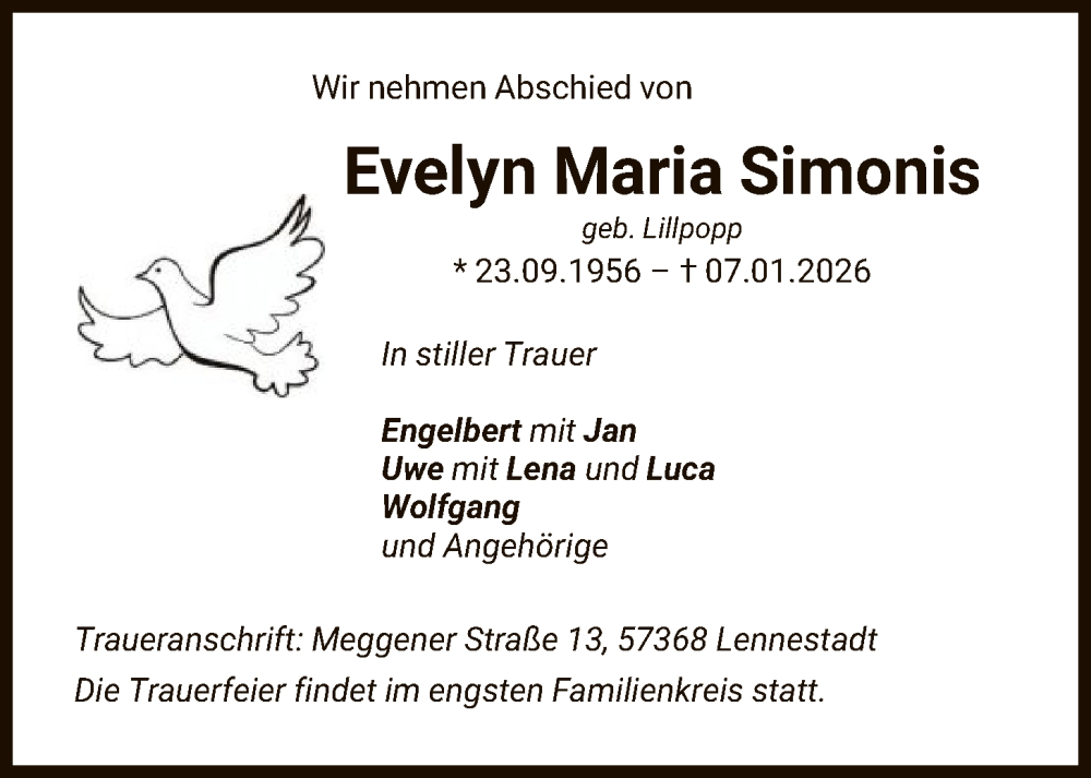 Hier finden Sie alle Traueranzeigen aus der Zeitung, die bisher für Evelyn Maria Simonis erschienen sind. Weitere Traueranzeigen, die in der Zeitung erscheinen, werden hier ebenfalls aufgelistet