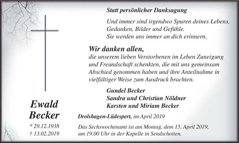 Hier finden Sie alle Traueranzeigen aus der Zeitung, die bisher für Ewald Becker erschienen sind. Weitere Traueranzeigen, die in der Zeitung erscheinen, werden hier ebenfalls aufgelistet