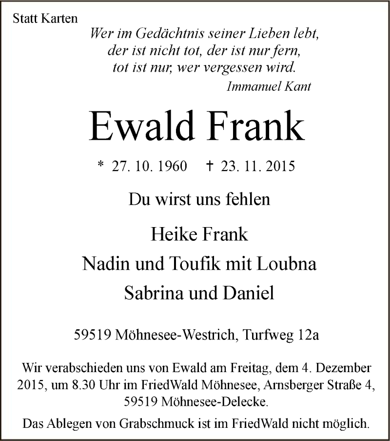 Hier finden Sie alle Traueranzeigen aus der Zeitung, die bisher für Ewald Frank erschienen sind. Weitere Traueranzeigen, die in der Zeitung erscheinen, werden hier ebenfalls aufgelistet