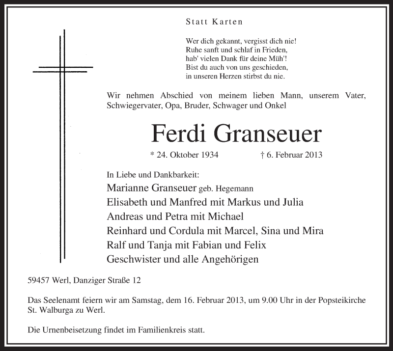 Hier finden Sie alle Traueranzeigen aus der Zeitung, die bisher für Ferdi Granseuer erschienen sind. Weitere Traueranzeigen, die in der Zeitung erscheinen, werden hier ebenfalls aufgelistet