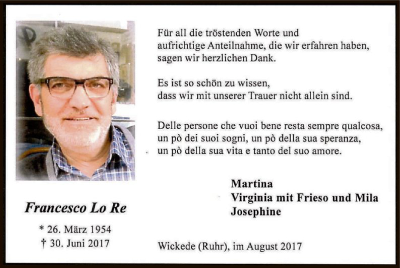 Hier finden Sie alle Traueranzeigen aus der Zeitung, die bisher für Francesco Lo Re erschienen sind. Weitere Traueranzeigen, die in der Zeitung erscheinen, werden hier ebenfalls aufgelistet