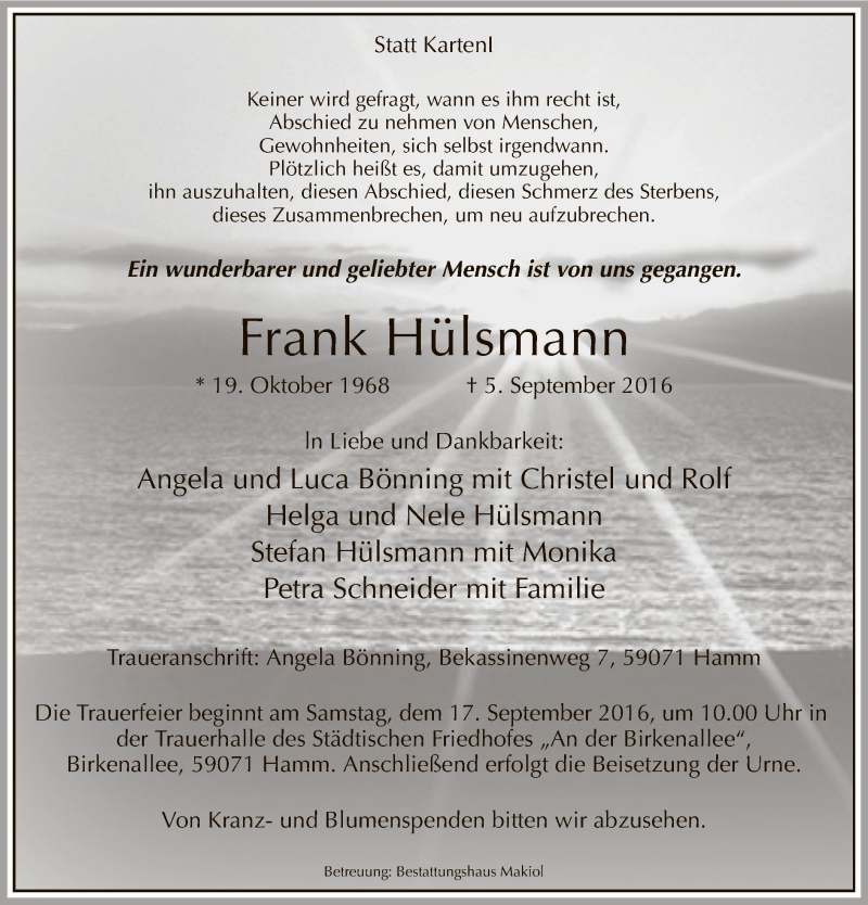 Hier finden Sie alle Traueranzeigen aus der Zeitung, die bisher für Frank Hülsmann erschienen sind. Weitere Traueranzeigen, die in der Zeitung erscheinen, werden hier ebenfalls aufgelistet