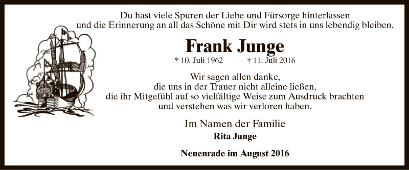 Hier finden Sie alle Traueranzeigen aus der Zeitung, die bisher für Frank Junge erschienen sind. Weitere Traueranzeigen, die in der Zeitung erscheinen, werden hier ebenfalls aufgelistet