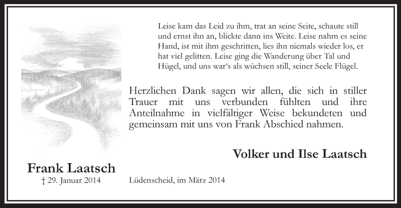 Hier finden Sie alle Traueranzeigen aus der Zeitung, die bisher für Frank Laatsch erschienen sind. Weitere Traueranzeigen, die in der Zeitung erscheinen, werden hier ebenfalls aufgelistet