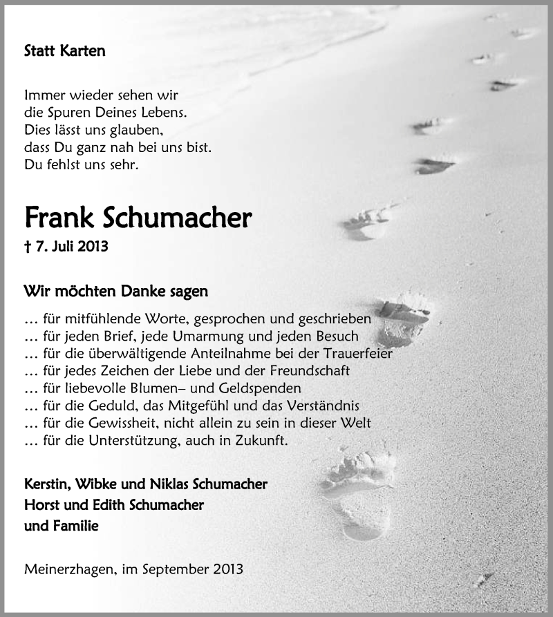 Hier finden Sie alle Traueranzeigen aus der Zeitung, die bisher für Frank Schumacher erschienen sind. Weitere Traueranzeigen, die in der Zeitung erscheinen, werden hier ebenfalls aufgelistet