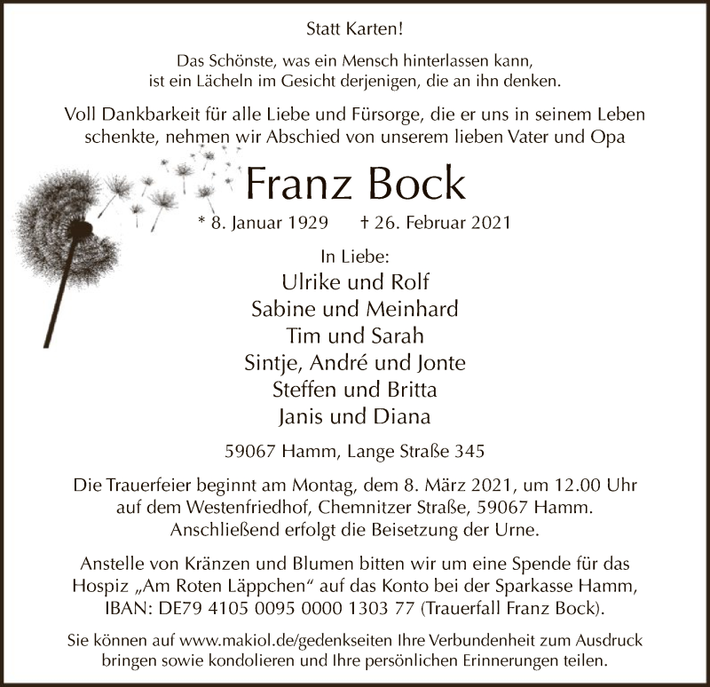 Hier finden Sie alle Traueranzeigen aus der Zeitung, die bisher für Franz Bock erschienen sind. Weitere Traueranzeigen, die in der Zeitung erscheinen, werden hier ebenfalls aufgelistet