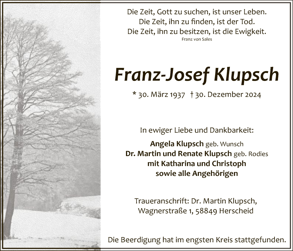 Hier finden Sie alle Traueranzeigen aus der Zeitung, die bisher für Franz-Josef Klupsch erschienen sind. Weitere Traueranzeigen, die in der Zeitung erscheinen, werden hier ebenfalls aufgelistet