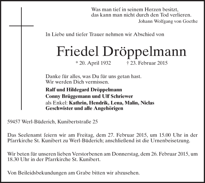 Hier finden Sie alle Traueranzeigen aus der Zeitung, die bisher für Friedel Dröppelmann erschienen sind. Weitere Traueranzeigen, die in der Zeitung erscheinen, werden hier ebenfalls aufgelistet
