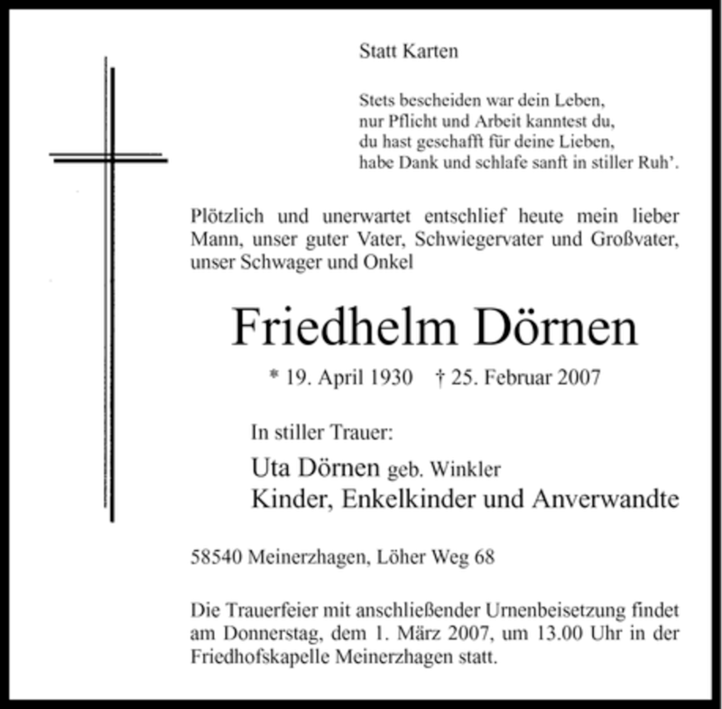 Hier finden Sie alle Traueranzeigen aus der Zeitung, die bisher für Friedhelm Dörnen erschienen sind. Weitere Traueranzeigen, die in der Zeitung erscheinen, werden hier ebenfalls aufgelistet