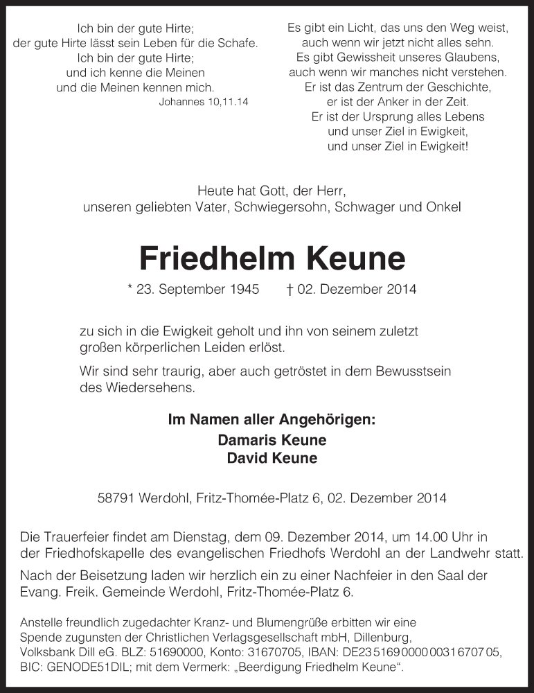 Hier finden Sie alle Traueranzeigen aus der Zeitung, die bisher für Friedhelm Keune erschienen sind. Weitere Traueranzeigen, die in der Zeitung erscheinen, werden hier ebenfalls aufgelistet