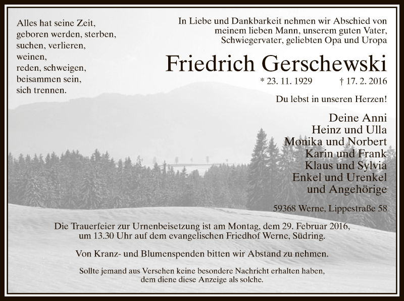 Hier finden Sie alle Traueranzeigen aus der Zeitung, die bisher für Friedrich Gerschewski erschienen sind. Weitere Traueranzeigen, die in der Zeitung erscheinen, werden hier ebenfalls aufgelistet