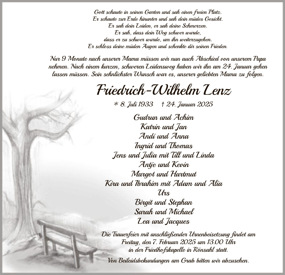 Hier finden Sie alle Traueranzeigen aus der Zeitung, die bisher für Friedrich-Wilhelm Lenz erschienen sind. Weitere Traueranzeigen, die in der Zeitung erscheinen, werden hier ebenfalls aufgelistet