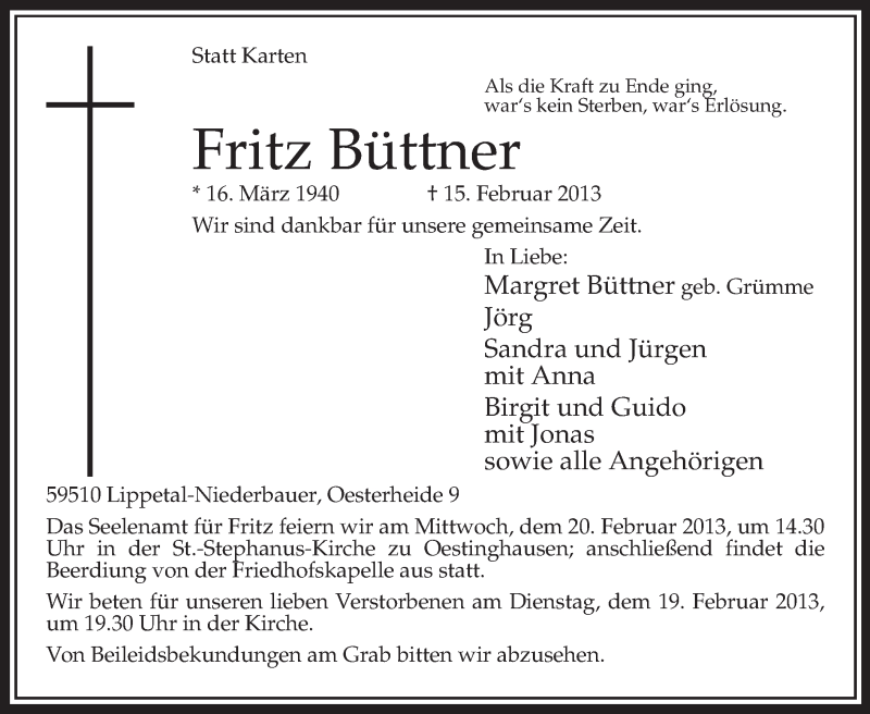 Hier finden Sie alle Traueranzeigen aus der Zeitung, die bisher für Fritz Büttner erschienen sind. Weitere Traueranzeigen, die in der Zeitung erscheinen, werden hier ebenfalls aufgelistet