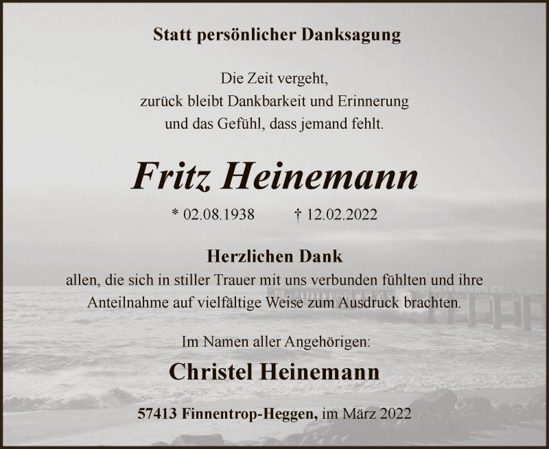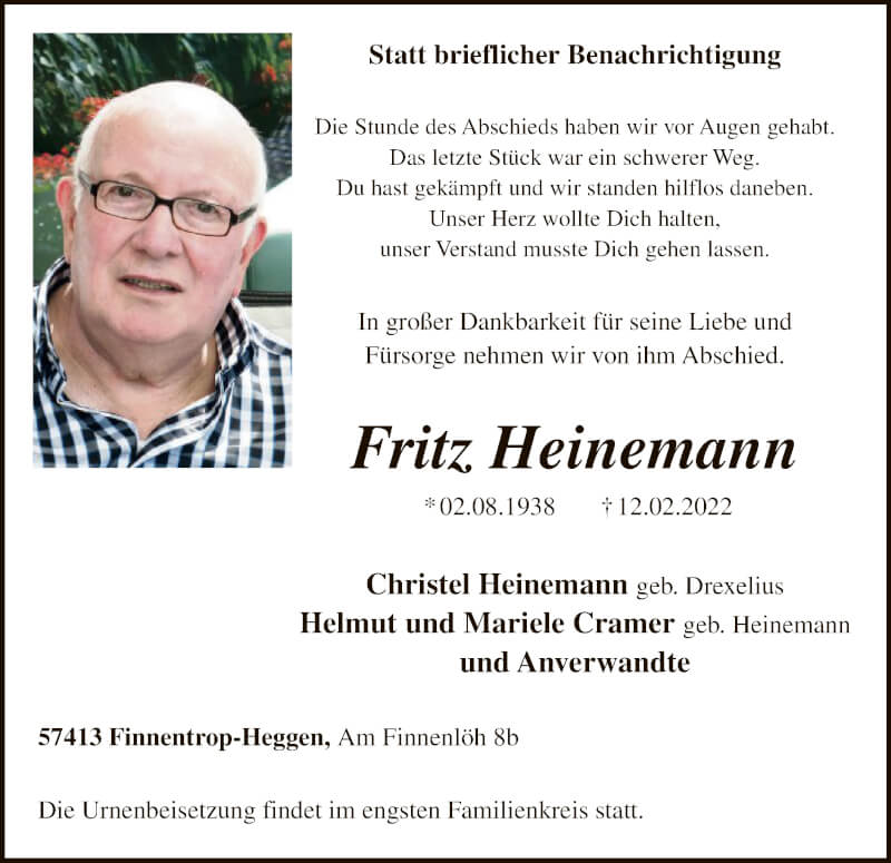 Hier finden Sie alle Traueranzeigen aus der Zeitung, die bisher für Fritz Heinemann erschienen sind. Weitere Traueranzeigen, die in der Zeitung erscheinen, werden hier ebenfalls aufgelistet