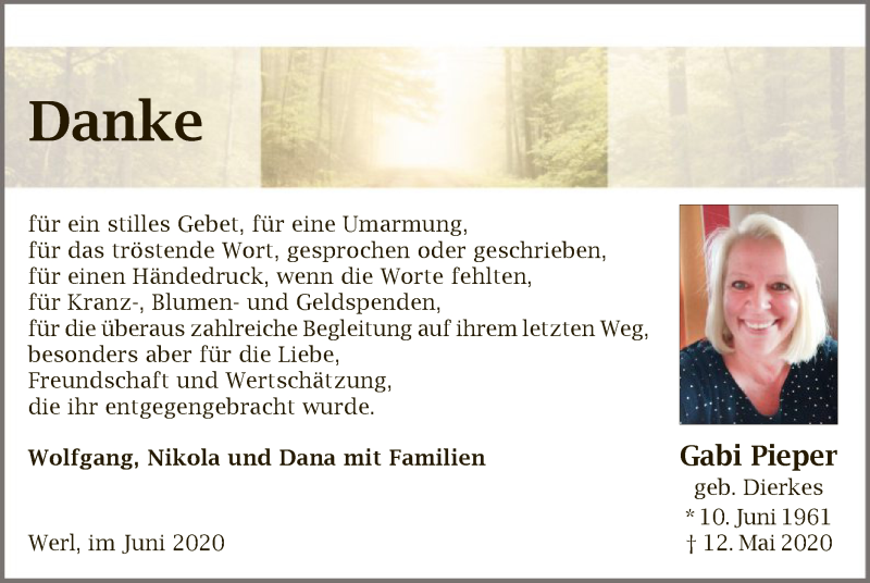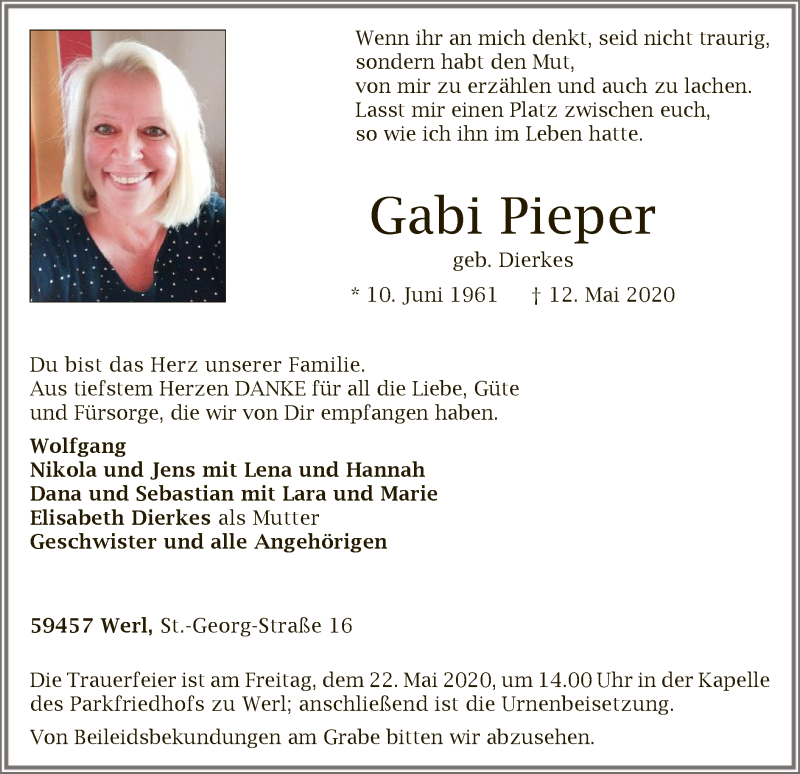 Hier finden Sie alle Traueranzeigen aus der Zeitung, die bisher für Gabi Pieper erschienen sind. Weitere Traueranzeigen, die in der Zeitung erscheinen, werden hier ebenfalls aufgelistet