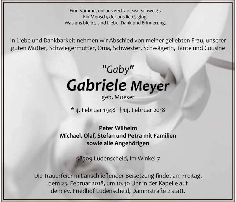 Hier finden Sie alle Traueranzeigen aus der Zeitung, die bisher für Gabriele Meyer erschienen sind. Weitere Traueranzeigen, die in der Zeitung erscheinen, werden hier ebenfalls aufgelistet