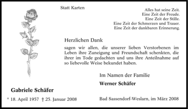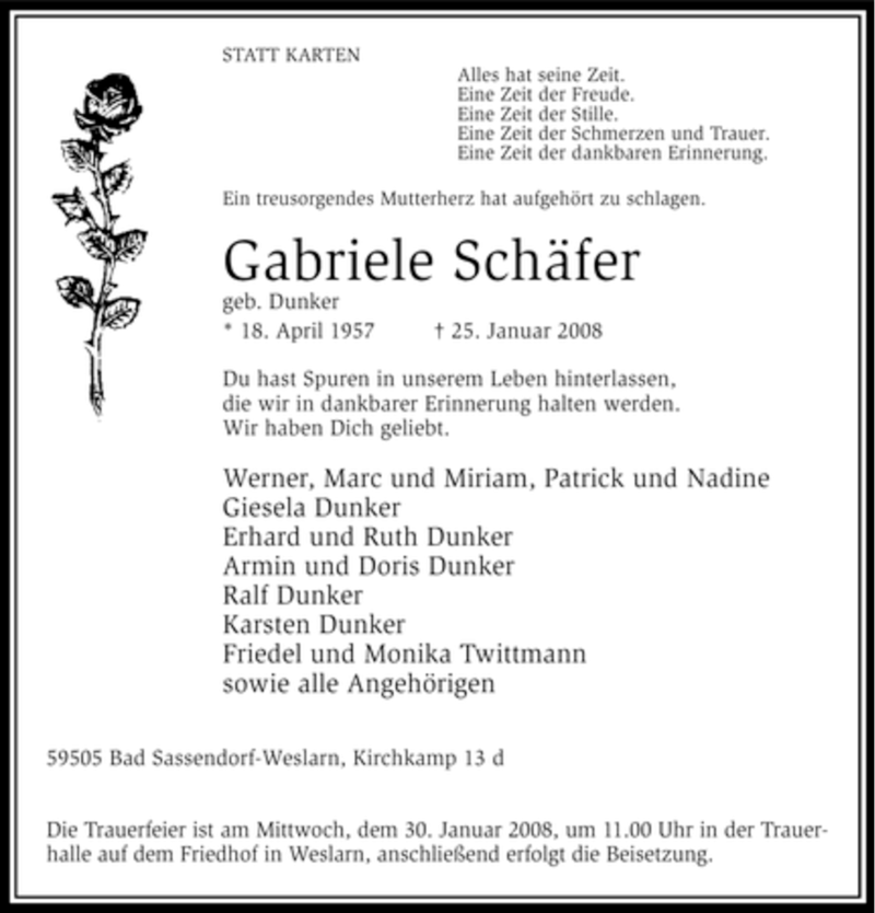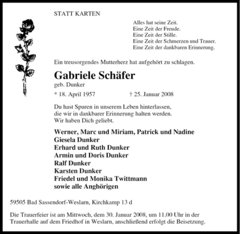 Hier finden Sie alle Traueranzeigen aus der Zeitung, die bisher für Gabriele Schäfer erschienen sind. Weitere Traueranzeigen, die in der Zeitung erscheinen, werden hier ebenfalls aufgelistet