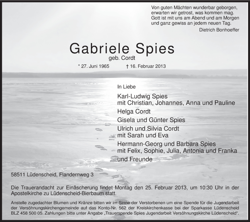 Hier finden Sie alle Traueranzeigen aus der Zeitung, die bisher für Gabriele Spies erschienen sind. Weitere Traueranzeigen, die in der Zeitung erscheinen, werden hier ebenfalls aufgelistet