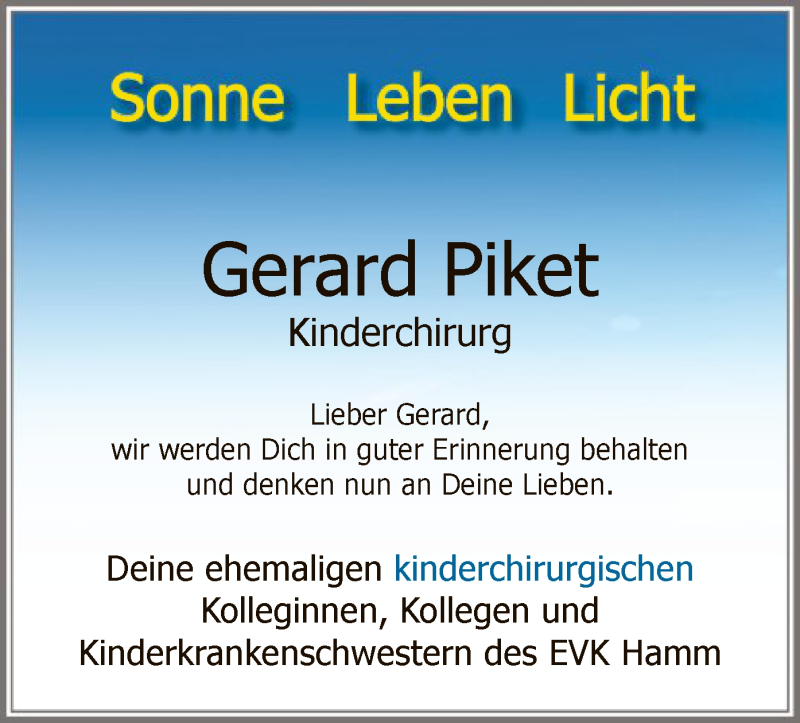 Hier finden Sie alle Traueranzeigen aus der Zeitung, die bisher für Gerard Piket erschienen sind. Weitere Traueranzeigen, die in der Zeitung erscheinen, werden hier ebenfalls aufgelistet