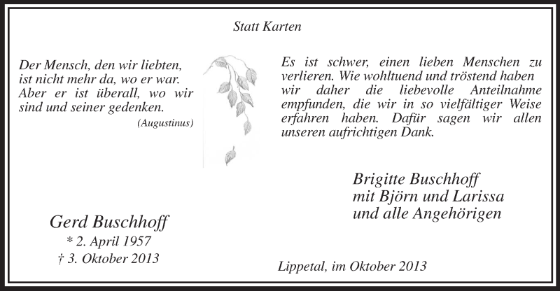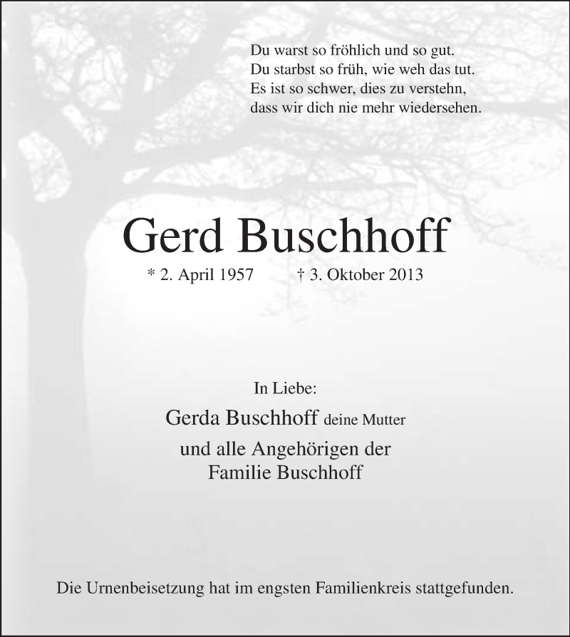 Hier finden Sie alle Traueranzeigen aus der Zeitung, die bisher für Gerd Buschhoff erschienen sind. Weitere Traueranzeigen, die in der Zeitung erscheinen, werden hier ebenfalls aufgelistet