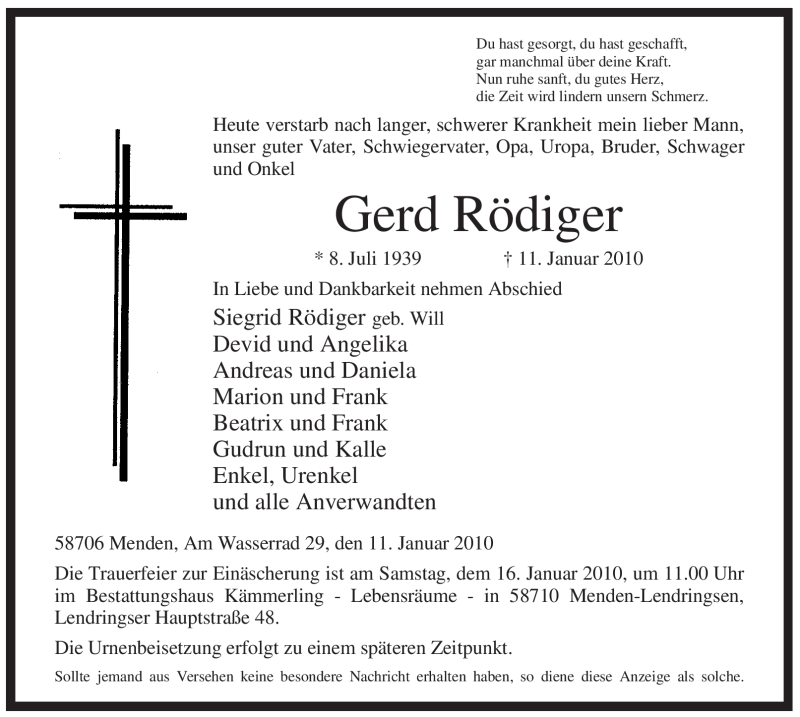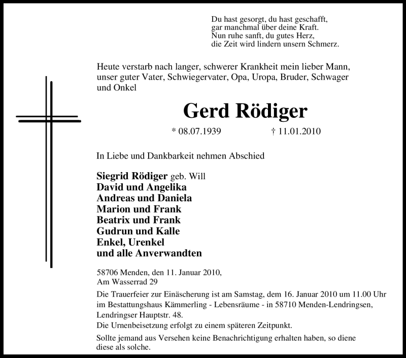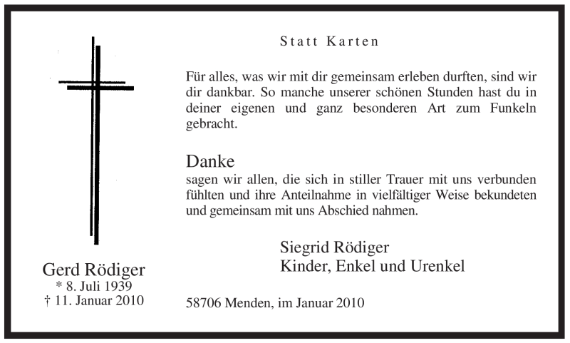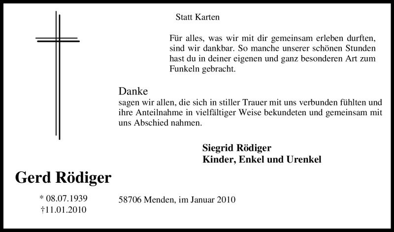 Hier finden Sie alle Traueranzeigen aus der Zeitung, die bisher für Gerd Rödiger erschienen sind. Weitere Traueranzeigen, die in der Zeitung erscheinen, werden hier ebenfalls aufgelistet