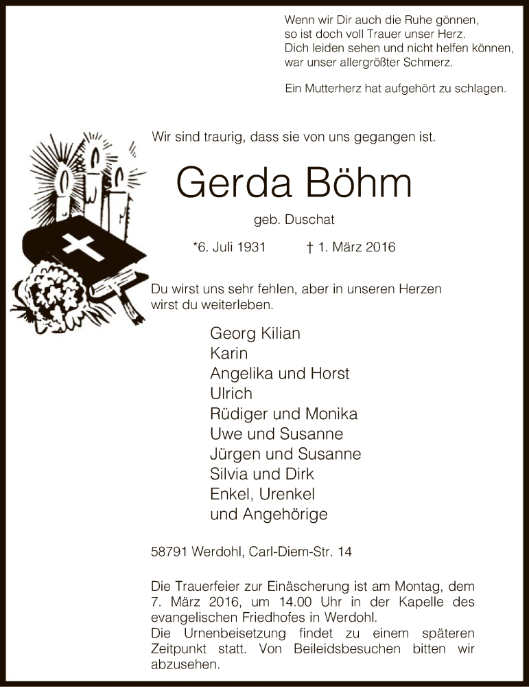 Hier finden Sie alle Traueranzeigen aus der Zeitung, die bisher für Gerda Böhm erschienen sind. Weitere Traueranzeigen, die in der Zeitung erscheinen, werden hier ebenfalls aufgelistet