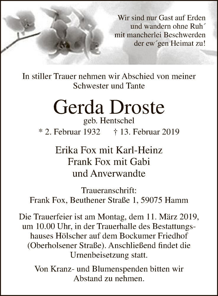 Hier finden Sie alle Traueranzeigen aus der Zeitung, die bisher für Gerda Droste erschienen sind. Weitere Traueranzeigen, die in der Zeitung erscheinen, werden hier ebenfalls aufgelistet