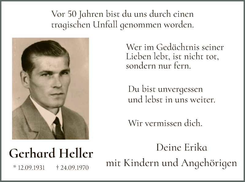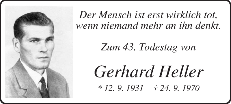 Hier finden Sie alle Traueranzeigen aus der Zeitung, die bisher für Gerhard Heller erschienen sind. Weitere Traueranzeigen, die in der Zeitung erscheinen, werden hier ebenfalls aufgelistet