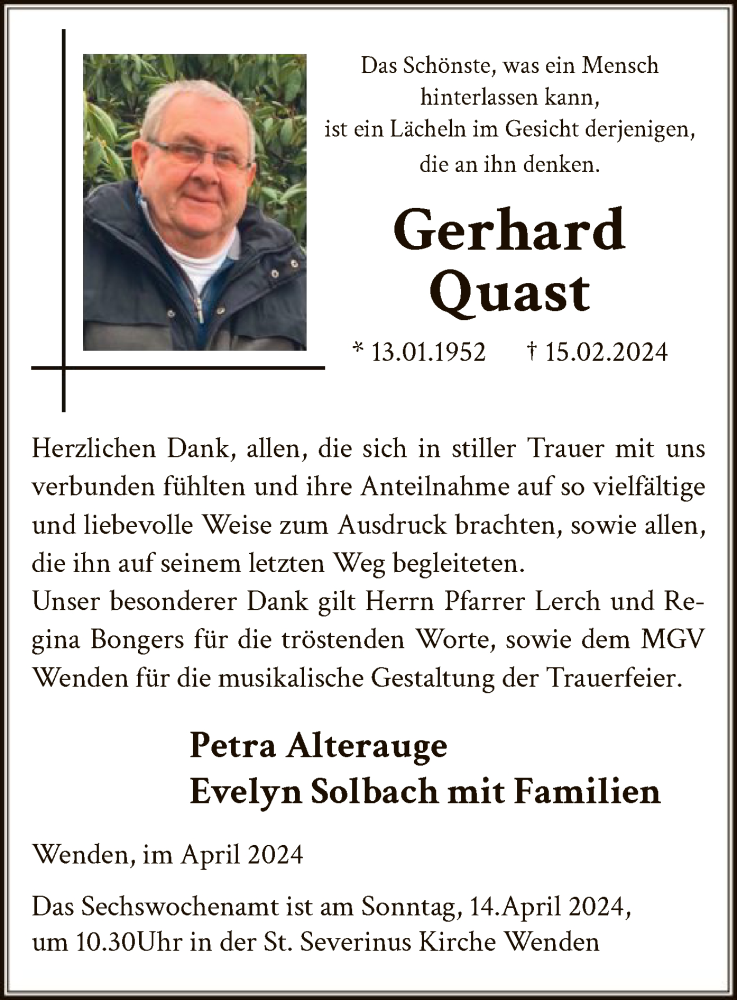 Hier finden Sie alle Traueranzeigen aus der Zeitung, die bisher für Gerhard Quast erschienen sind. Weitere Traueranzeigen, die in der Zeitung erscheinen, werden hier ebenfalls aufgelistet