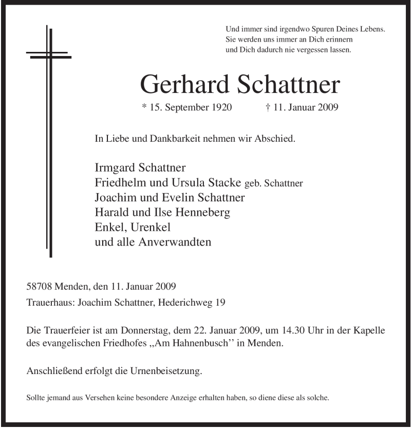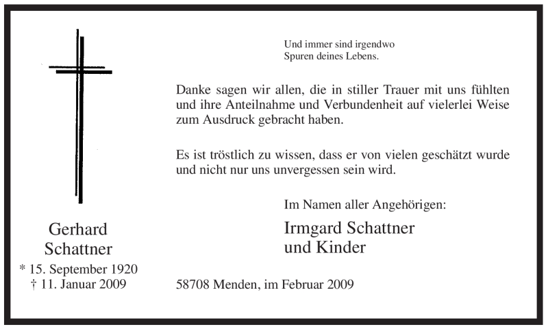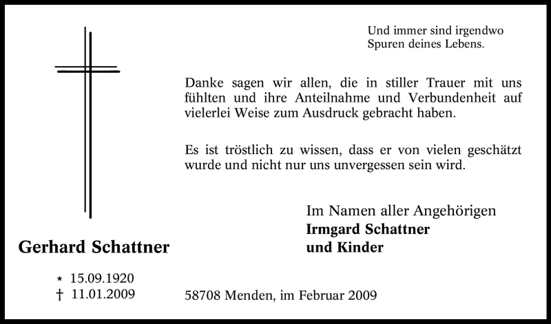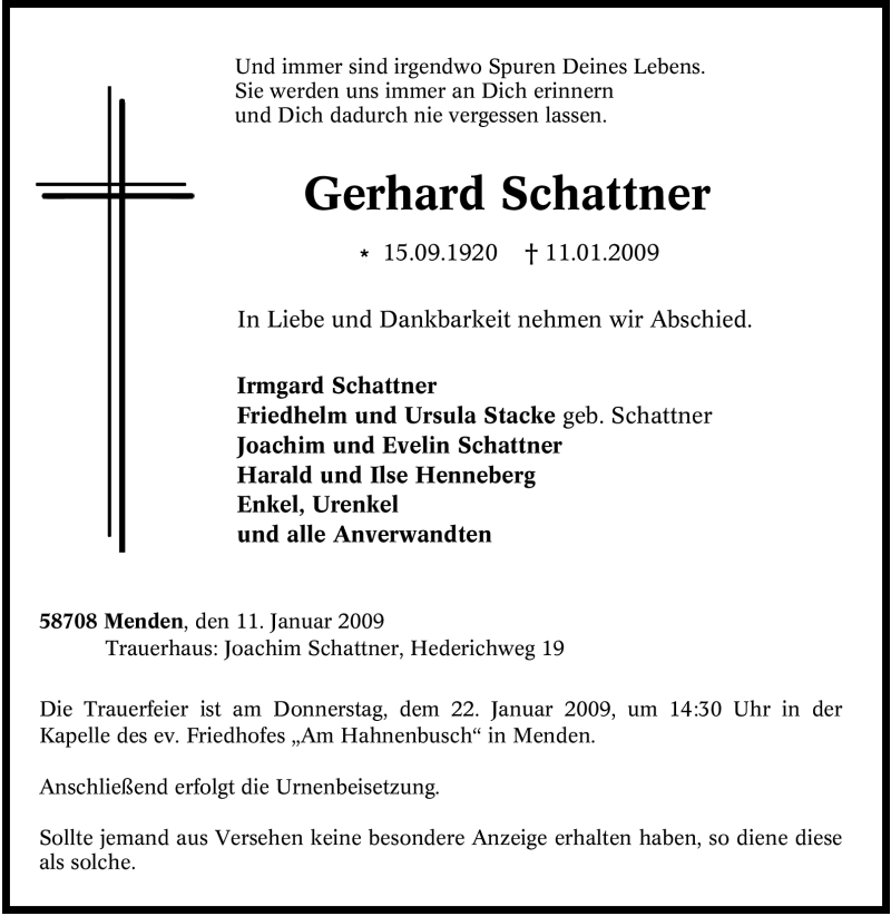 Hier finden Sie alle Traueranzeigen aus der Zeitung, die bisher für Gerhard Schattner erschienen sind. Weitere Traueranzeigen, die in der Zeitung erscheinen, werden hier ebenfalls aufgelistet