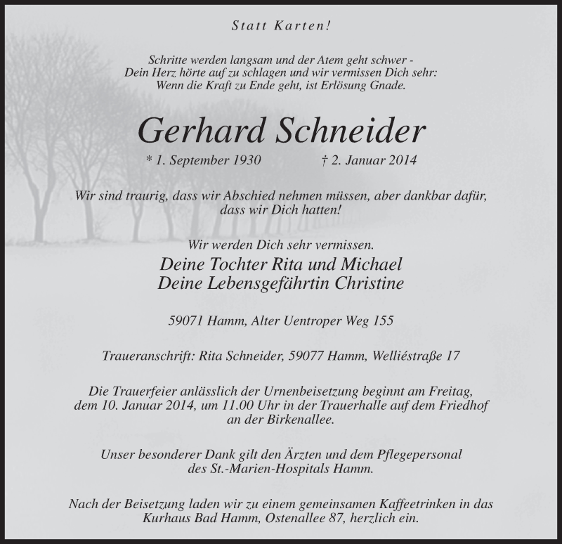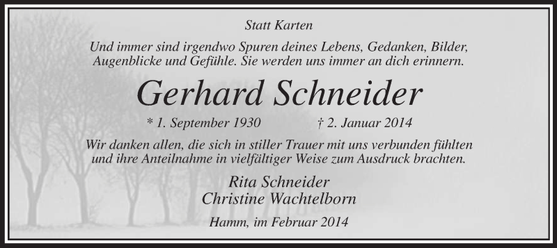 Hier finden Sie alle Traueranzeigen aus der Zeitung, die bisher für Gerhard Schneider erschienen sind. Weitere Traueranzeigen, die in der Zeitung erscheinen, werden hier ebenfalls aufgelistet