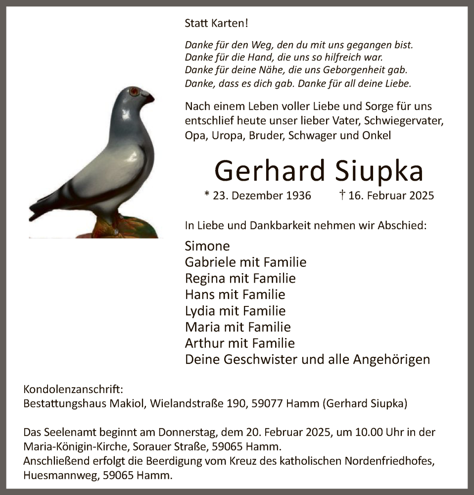 Hier finden Sie alle Traueranzeigen aus der Zeitung, die bisher für Gerhard Siupka erschienen sind. Weitere Traueranzeigen, die in der Zeitung erscheinen, werden hier ebenfalls aufgelistet