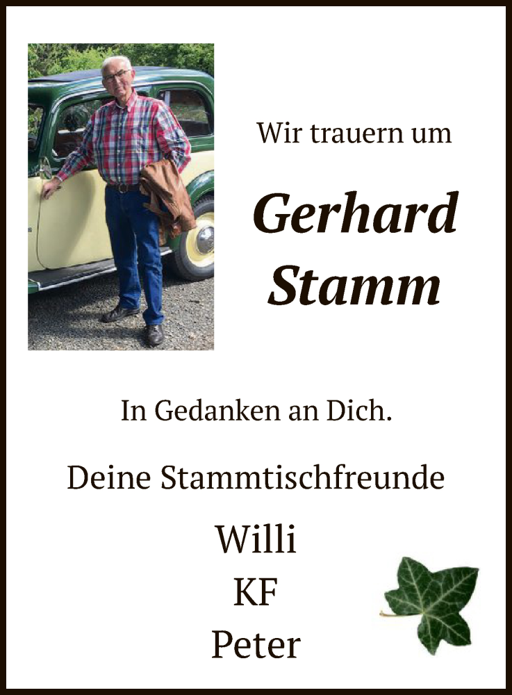 Hier finden Sie alle Traueranzeigen aus der Zeitung, die bisher für Gerhard Stamm erschienen sind. Weitere Traueranzeigen, die in der Zeitung erscheinen, werden hier ebenfalls aufgelistet